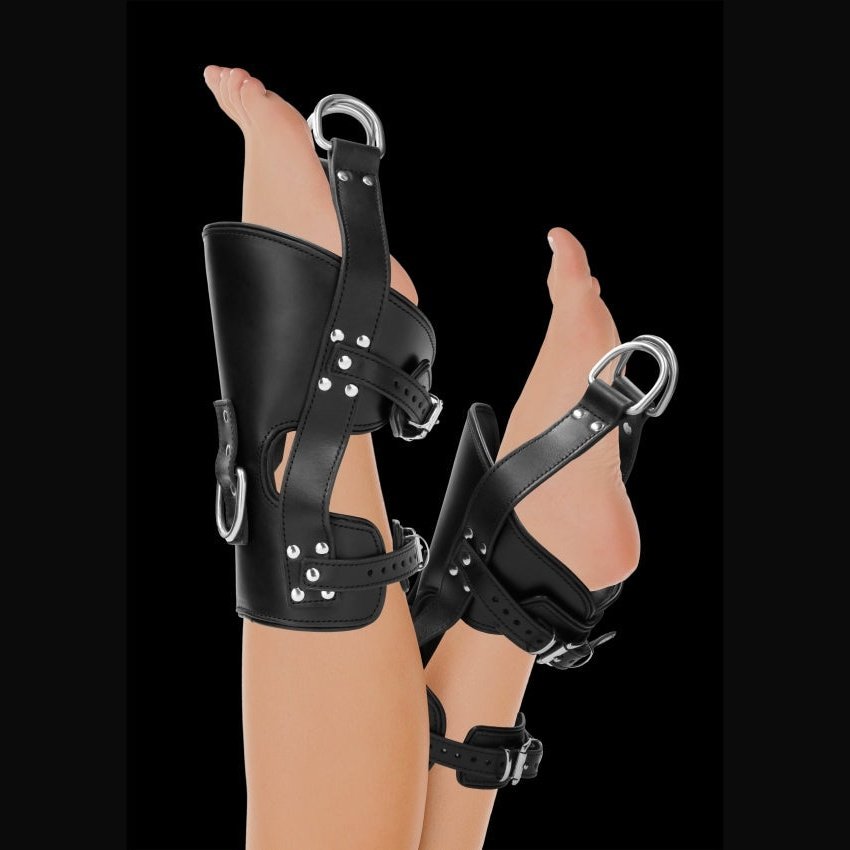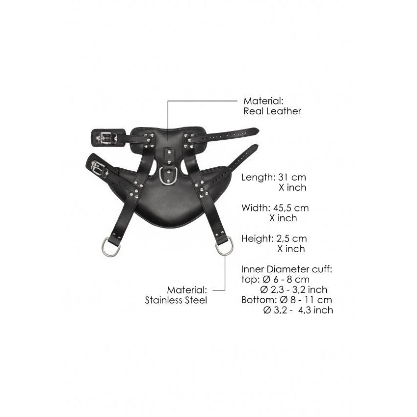 Suspend your sub with these real leather heavy-duty SADDLE LEATHER HEAVY DUTY SUSPENSION CUFFS. Made from genuine leather, these BDSM restraint cuffs provide great comfort while leaving your slave suspended and yearning for more. Thanks to the adjustable buckles they will slide around any wrist for a snug and restrictive fit. These cuffs can easily be attached to any large bolt or hook with the 2 incorporated O-rings. For teasing, pleasing and suspending even the naughtiest of slaves!